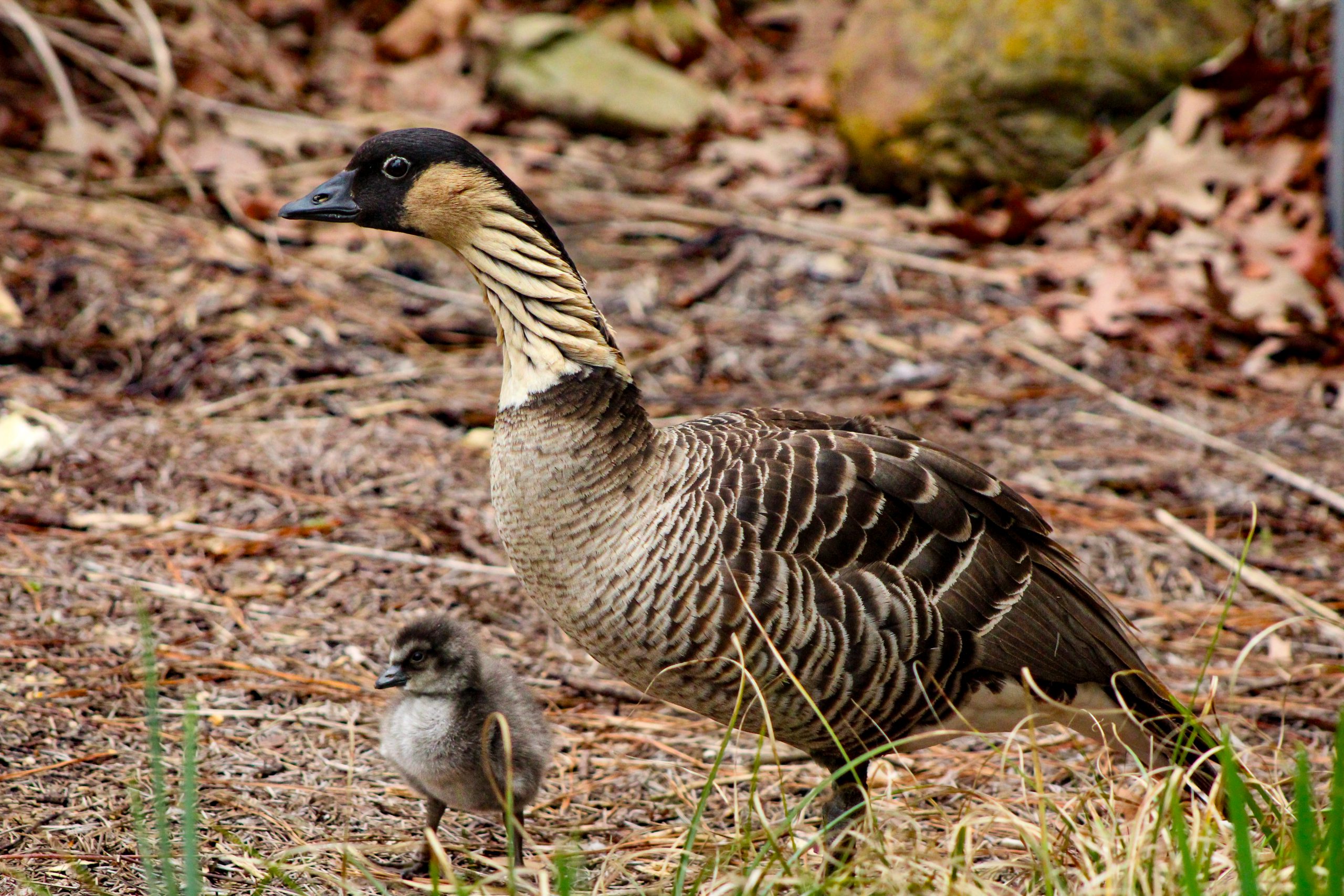 Nene with gosling. Only 1 of the 3 eggs in this Nene nest hatched, but the gosling is doing well under the watchful eye of the parents.